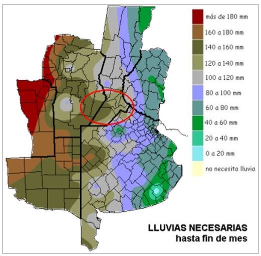 El mapa plantea la demanda necesaria para devolver las reservas a niveles adecuados, sin embargo no es que forzosamente que esta demanda deba ser compensada. Los cultivos pueden reaccionar favorablemente con menor cantidad de precipitaciones, sin embargo, el ejercicio teórico es un indicio de cómo se está transitando este momento del año. Ya habiendo superado la mitad de la primavera, a gran escala, el patrón pluvial no ha sido la mejor para la zona agrícola más importante del país.