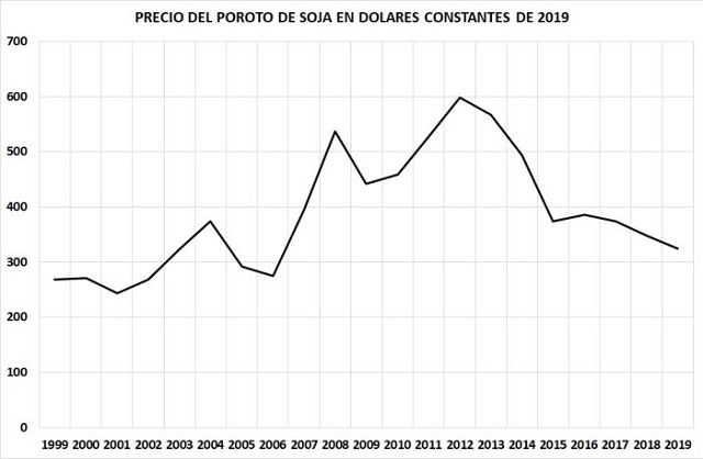 El dilema que tiene que enfrentar la economía argentina es que el gasto público consolidado pasó de 30% del PBI al 47% en el momento en que el viento de cola permitía financiar el aumento del gasto público. En dólares constantes de 2019, De la Rúa tuvo un precio promedio del poroto de soja de US$ 257, Néstor Kirchner tuvo una soja a US$ 323 la tonelada, 26% más en términos reales que De la Rúa. En su primer mandato, Cristina Kirchner tuvo una soja promedio de US$ 491 y en el segundo mandato el precio promedio fue de US$ 508. Finalmente, Macri gobernó con una soja promedio de US$ 358 la tonelada. No es lo mismo lo que se recauda por derechos de exportación con una soja de US$ 508 que con una soja de US$ 358. La caja es diferente.