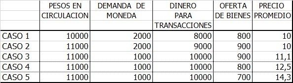 Supongamos el caso 1 que sería el actual. Hay emitidos 10.000, la demanda de moneda es de 2.000, por lo tanto el dinero para transacciones es de 8.000. La oferta de bienes y servicios es de 800 unidades, por lo tanto el precio promedio que surge de dividir el dinero para transacciones por la oferta de bienes, es 10.