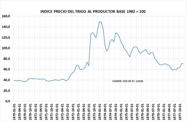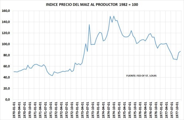 El precio del maíz sigue el mismo comportamiento que el del trigo, siendo dos de los granos de mayor producción en esos años. La producción de trigo pasa de 5,4 millones de toneladas en 1972 a 7,9 millones en 1973. Un equivalente al boom de la soja de principios del siglo XXI.