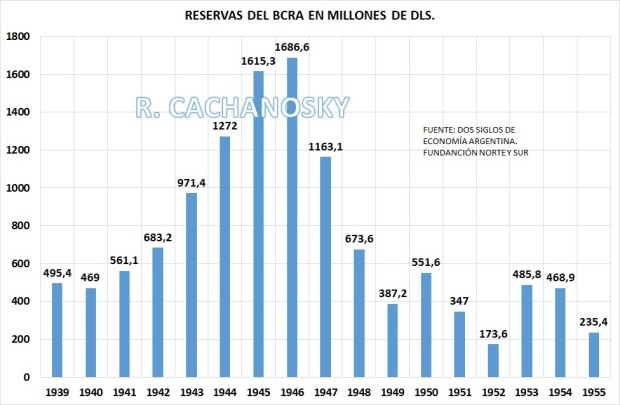 Entre 1939, año en que comienza la Segunda Guerra con la invasión de Alemania a Polonia y 1945 las reservas del BCRA se multiplica por 3, en tanto que Perón, derrocado en septiembre de 1955, termina con el 15% de stock de reservas con que asumió. Tengamos presente que los datos del gráfico están a dólares corrientes, lo que quiere decir que ajustados por inflación le dan una gran caja a Juan Perón al inicio de su primer mandato. Luego tuvo los problemas económicos que terminaron con racionamiento pero no voy a entrar en los detalles de su política económica en sus dos primeros mandatos, solo marcar que el primero lo inicia con una muy buena caja que le daban las reservas del BCRA, al punto que es recordada la famosa frase de Perón: «No podemos caminar por los pasillos del Banco Central, tan abarrotados están de lingotes de oro».