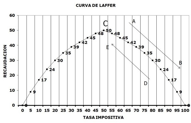Recordemos la curva de Laffer. A medida que aumenta la tasa del impuesto (eje horizontal) se incrementa la recaudación (eje vertical), pero llega un punto, supongamos el punto C, en que todo aumento de la tasa impositiva genera menos recaudación porque se opera en negro, desaparecen los productores marginales, etc.