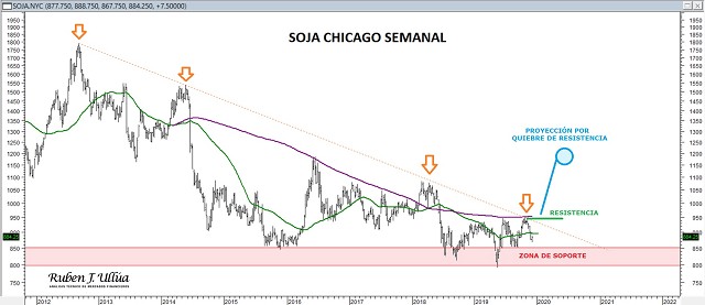 En lo que respecta a la soja, actualmente los precios consolidan en la franja de 800-950 centavos. Observamos que cada vez que los precios se acercan a la zona de 850-800 centavos, aparecen compradores en este mercado y terminan recuperando la cotización hacia la zona de 930-950 centavos. Sin embargo, como se aprecia en la gráfica, los precios han fallada más de una vez en dar superación a esta zona de escollo de 930-950 centavos y tras testearla, hemos visto nuevas debilidades en el precio del commodity, tal como las sufridas en las últimas semanas.