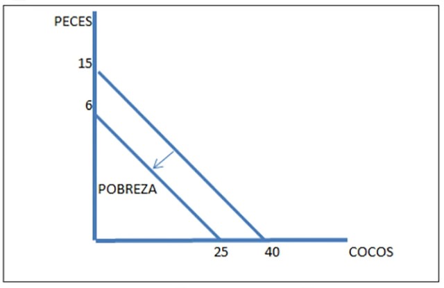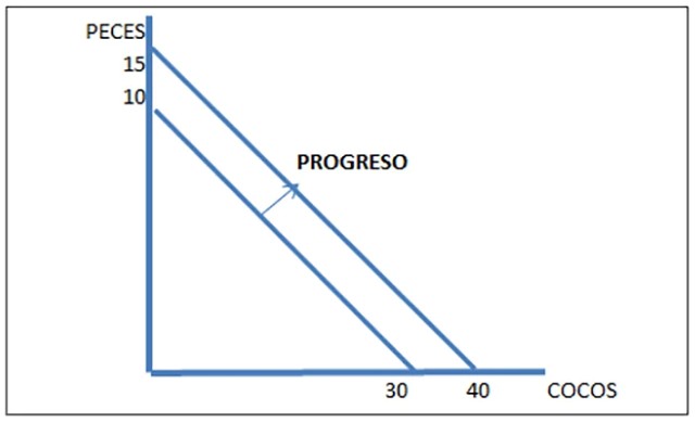 El gráfico anterior muestra que trabajando la misma cantidad de horas, Robinson Crusoe puede obtener mayor cantidad de peces, de 10 a 15 si se dedica exclusivamente a la pesca, o pasar de 30 a 40 cocos si sólo destina su tiempo a bajarlos del árbol.