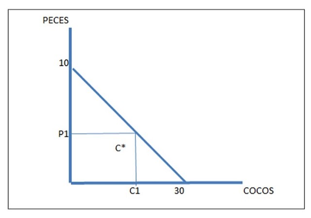 Para graficar el problema supongamos que Robinson Crusoe está en la isla y está dispuesto a trabajar 8 horas por día. Si tomamos el gráfico 1 podemos suponer que si trabaja 8 horas por día, puede treparse a un árbol y conseguir 30 cocos por día y si las 8 horas las dedica únicamente a pescar, consigue 10 peces por día.