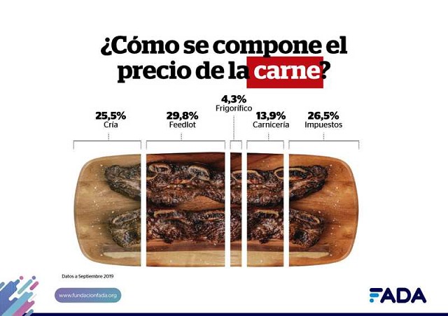 Del precio final de la carne vacuna: el 72,3% son costos de la cadena, 26,5% impuestos y 1,2% ganancias. Para ser más gráficos.