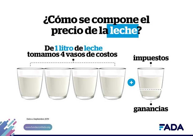 “La mayor parte del precio se va en los costos de producción, elaboración y comercialización. El caso de la leche es el más llamativo: en un litro de leche, nos tomamos cuatro vasos de costos y un quinto vaso se reparte en impuestos y ganancias de la cadena” (midiendo con vasos de 200 cc.), señala Natalia Ariño, economista de FADA. “En el caso del pan el costo alcanza casi el 60% mientras que en la carne llega al 72,3%”.