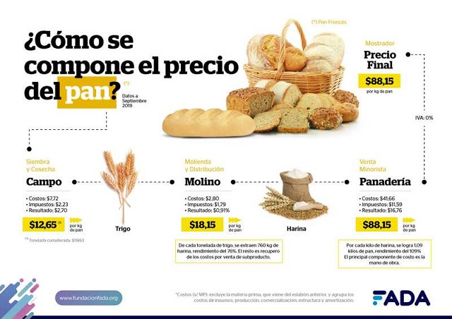Del precio final promedio de pan, el 59,2% son costos, el 17,71% impuestos y el 23,10% ganancias. De esos impuestos, casi 3 de cada 4 son nacionales, 22,7% son provinciales y 3,3% son municipales. Si analizamos la cadena, del importe final del pan, el trigo (productor) representa el 11,8%, el molino el 4,2%, la panadería el 66,3% y los impuestos el 17,7%.