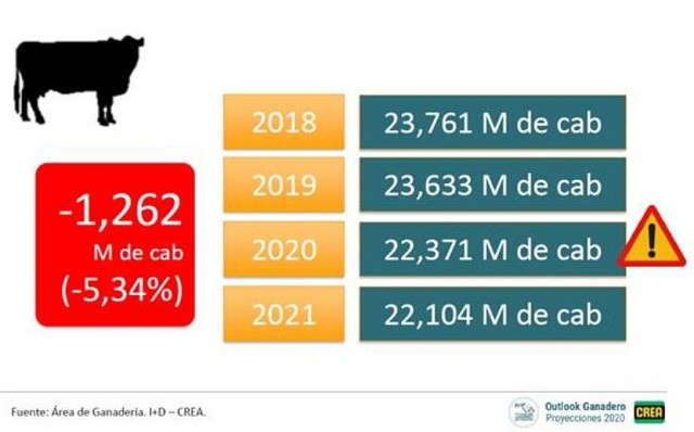 En las condiciones actuales se prevé para 2020 una caída superior al 5% de la cantidad de vacas con respecto a 2019, proceso que, si llegara finalmente a consolidarse la presencia de una sequía estival significativa en la mayor parte de la zona pampeana argentina, podría profundizarse (en la actualidad la restricción hídrica se focaliza fundamentalmente en La Pampa y sudoeste bonaerense).