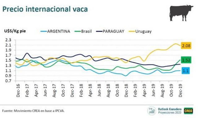 "Argentina cierra un 2019 con un récord histórico de exportación de unas 830.000 toneladas res con hueso gracias al impulso de la demanda china; lo que representa un ingreso al país de 2965.25 millones de dólares. Esto se dio por el impacto de la fiebre porcina africana sobre la producción asiática de carne de cerdo sumado a nuevas habilitaciones de frigoríficos para exportar carne a China en un marco de tipo de cambio favorable para realizar exportaciones". Aunque, el referente CREA, aclaró que en las últimas semanas el gobierno chino está instrumentando medidas para desacelerar los precios de importación de la carne bovina luego de que en noviembre pasado se registraran máximos históricos.