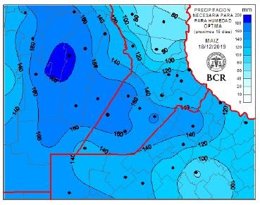 Sur de Santa Fe, parte del norte bonaerense y este cordobés necesitan más de 140 mm para cubrir las necesidades de la etapa crítica del cultivo. "Si llueve pueden rendir 90 a 100 quintales, pero sino, caer a 50 o 60 qq/ha”, comentan santafesino. La excepción es la zona cercana al centro de la provincia, cómo en Carlos Pellegrini, dónde llovieron 70 mm, justo a tiempo para la floración y completar el llenado de grano de manera eficiente. Pero el 92% de la región muestra necesidades mayores a los 100 mm en 15 días para cubrir la demanda del cultivo en su etapa definitoria. En Pergamino ya se calcula una pérdida de hasta 20 % de rendimiento sobre suelos de menor calidad. "Los maíces de la primera tanda de siembra (principio de septiembre) están floreciendo, desparejos y con escasa biomasa", advierten los técnicos del área. Según como llueva los próximos días se define el maíz, si caen definitivamente sus rindes o sigue con posibilidades. Es el cultivo más afectado por la falta de agua y está en una situación crítica. El estrés es generalizado aunque se distinguen zonas aún con posibilidades y otras ya con graves daños irreversibles de rinde.