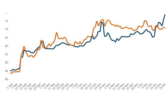 Así las cosas, no es de extrañar que los valores tiendan a mejorar, a nivel internacional, pues al mejor ambiente de negocios entre EE.UU. y China se unen los problemas climáticos a amenazan la oferta mundial. Nos referimos al el clima en EE.UU., Brasil e, incluso nuestro país.