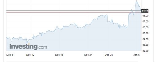 Hoy, el Brent del Mar del Norte, que cotiza en el mercado electrónico de Londres (ICE), se ubicaba en torno a USD 69.50 en los contratos para marzo.