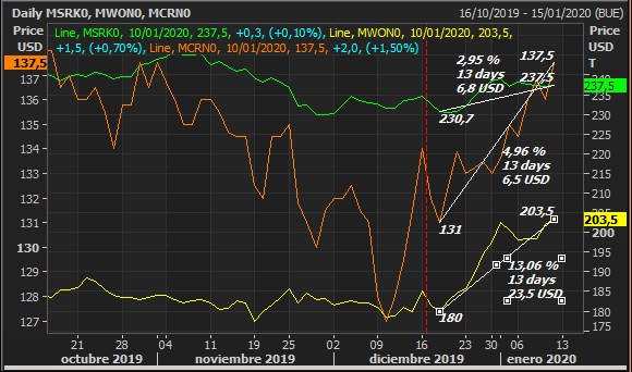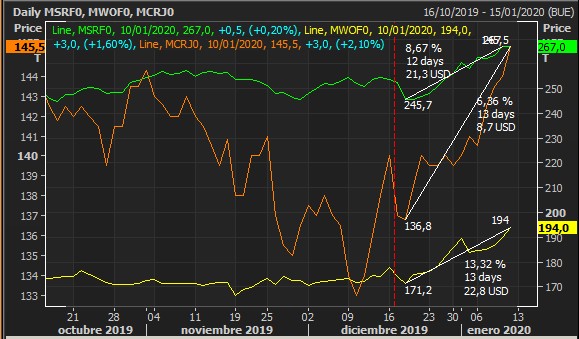*VERDE: Soja Mayo 20 / NARANJA Maíz Julio 20 / AMARILLO Julio 20 (cola de
