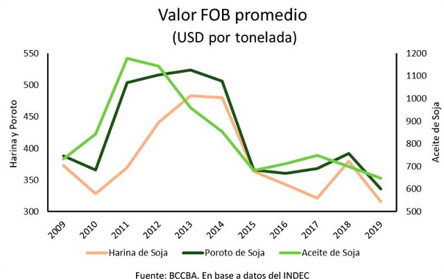 Por otro lado, si bien se dio un recupero en el volumen vendido, el precio no logró recomponerse, e incluso disminuyó para los tres productos. El precio de exportación cayó 17% para la harina de soja, 14% para el poroto y 7% para el aceite, los tres valores por debajo del promedio de los últimos cinco años.
