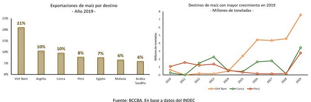 Con respecto a los destinos del maíz, Vietnam y Argelia siguen concentrando la mayor parte de las compras, representando entre ambos el 31% de lo comercializado durante 2019. Vietnam, que compró un promedio de 290.000 toneladas por año durante 2010-2014, incrementó notablemente sus compras en el período 2015-2019 a un promedio de 4,6 millones de toneladas por año. Por otro lado, en 2019 tanto Corea del Sur como Perú aumentaron en gran medida su nivel de compras de maíz argentino, llegando a importar 3,5 y 2,8 millones de toneladas respectivamente.