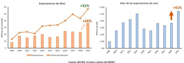 Las ventas al exterior de maíz crecieron un 56% durante 2019 para alcanzar un récord de 36 millones de toneladas. Este incremento fue mayor al crecimiento de la producción nacional de maíz durante la campaña 2018/19, que llegó a ser 31% superior al de la campaña previa.