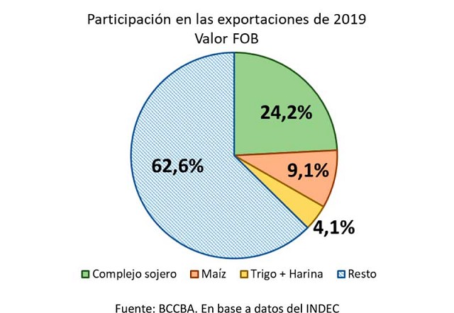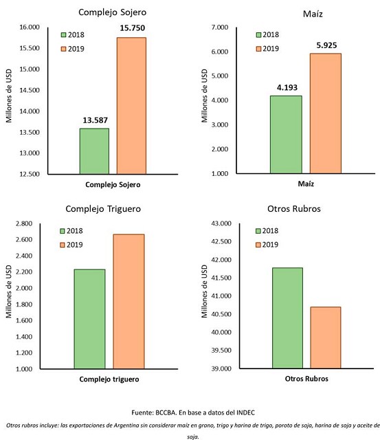 Del total, un 24% fue gracias al complejo sojero, 9% al maíz y 4% al complejo triguero, por lo que la suma de estos tres grupos concentró el 37,4% de las exportaciones totales. Como consecuencia de la cosecha récord de la campaña 2018/19, las exportaciones de estos productos agrícolas y sus subproductos crecieron un 22% en 2019 respecto al año previo, lo cual equivale a un incremento de USD 4.300 millones. Este monto se ubicó por encima del crecimiento total de las exportaciones (+ USD 3.330 millones), por lo que, a pesar de la caída en otros rubros, este grupo fue el responsable de la motorizar las ventas al exterior.