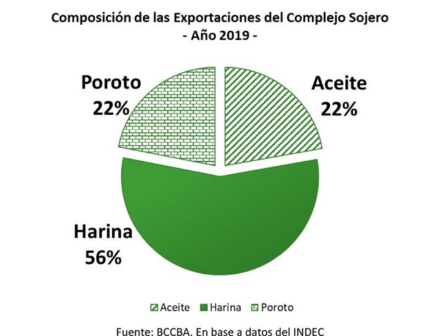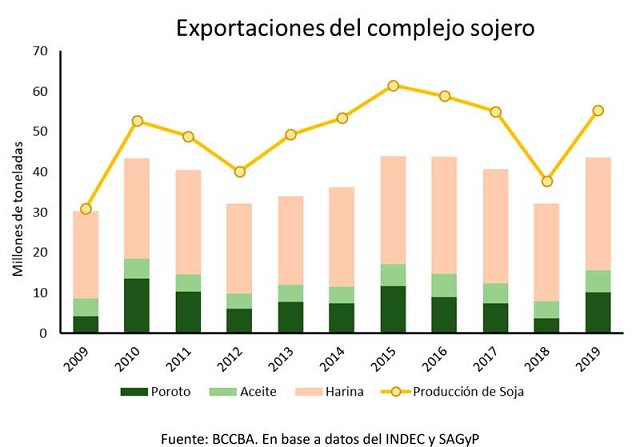 Las exportaciones del complejo sojero representaron 43,5 millones de toneladas en el 2019, monto superior al del año anterior en un 35%. El principal componente de este incremento fue la recuperación de las exportaciones de poroto de soja, cuyas ventas aumentaron un 178%, pasando de 3,7 millones de toneladas en 2018 a 10,2 millones en 2019. Asimismo, las exportaciones de los subproductos de la soja también observaron una mejora con respecto al año anterior, incrementando un 28% el aceite y un 15% la harina.