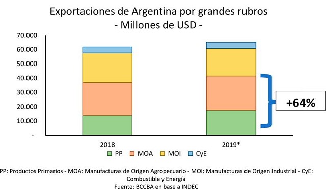 Las exportaciones argentinas alcanzaron los USD 65.000 millones en 2019, subiendo un 5,4% respecto al año previo. Desagregando por grandes rubros, los productos primarios fueron los que mayor aporte realizaron a esta suba, con una variación interanual de USD 3.519 millones. Seguidamente las exportaciones de manufacturas de origen agropecuario registraron un incremento de más de USD 1.000 millones y las de combustible y energía crecieron poco más de USD 170 millones. Estas subas más que compensaron la caída en las exportaciones de manufacturas de origen industrial de USD 1.400 millones. De esta manera, la cadena agroindustrial es la principal generadora de divisas para el país, con un aporte del 64% del total de las exportaciones. Es decir, de cada USD 10 que Argentina exporta, más de USD 6 tienen como origen la agroindustria.