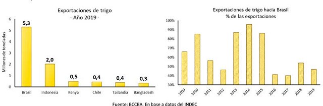 Por otro lado, Australia, que es el principal competidor del trigo argentino, sufrió una sequía por tercer año consecutivo, permitiendo que las ventas de trigo al exterior alcancen nuevos mercados y aumenten su participación en otros ya activos. Parte de esto se refleja en la participación de Brasil en las exportaciones argentinas. En 2019 la participación del país vecino en las ventas de trigo cayó al 47%, mientras que el promedio de los últimos 10 años fue de 64%.