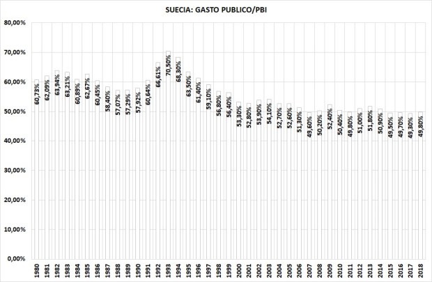 Pero lo que pocos conocen es que los países escandinavos bajaron en forma notable su gasto público/PBI. Por ejemplo, Suecia que llegó a tener una relación gasto público/PBI del 70,5% en 1993 lo bajó a niveles del 50% actualmente. Son 20 puntos menos de gasto público respecto al PBI.