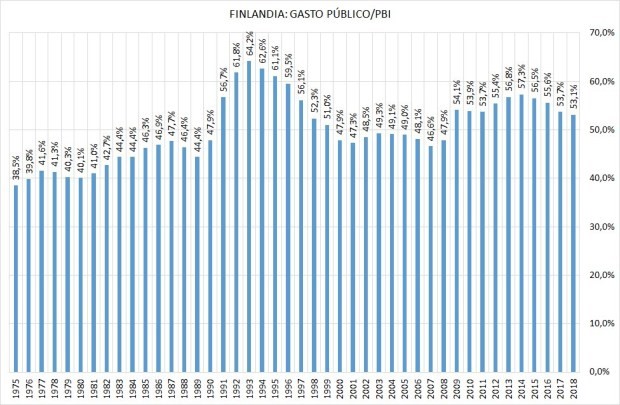 Finlandia llegó a tener una relación gasto público/PBI del 64% y ahora lo mantienen en el orden del 53%. 10 puntos menos de gasto público/PBI.