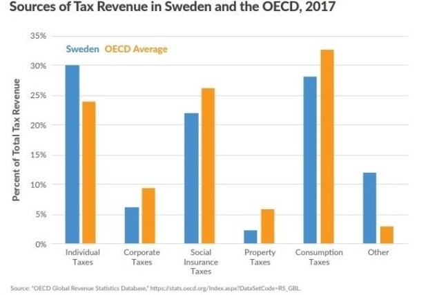 De acuerdo a datos de la OECD, este gasto público social se financia con impuestos que en Argentina son considerados regresivos por parte de los progres. En efecto, 2/3 de los ingresos tributarios se financian con impuestos al Valor Agregado, aportes sobre el salario, Seguridad Social y, lo más sorprendente, es que el impuesto a las ganancias de las personas físicas es altísimo, mayor que aquí. En cambio las empresas pagan impuestos a las ganancias muy bajos. Dinamarca 22%. Finlandia 20%, Noruega 22% y Suecia 21,4%. Es más, de acuerdo a los datos de la OECD, en 2017 el 30% del total de los ingresos tributarios de Suecia fueron por el impuesto a las ganancias a las personas, en tanto que el impuesto a las ganancias que pagaron las empresas representó poco más del 5% del total.