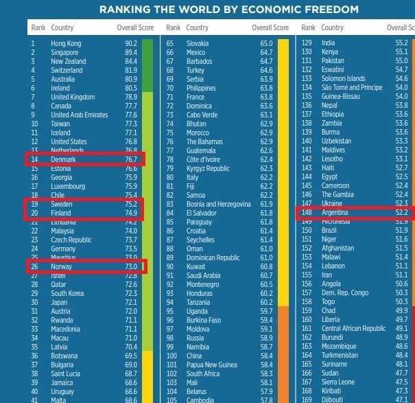 En realidad, los cuatro países mencionados se encuentran entre los primeros 26 países en el ranking del Índice de Libertad Económica como puede observarse en el cuadro 1. Dinamarca está en el puesto 14, Suecia en el 19, Finlandia en el 20 y Noruega en el 26. Es decir, lejos de ser economías socialistas o con fuerte intervención del estado, sus economías son abiertas, baja cantidad de regulaciones, particularmente en el mercado laboral, derechos de propiedad bien afianzados, etc. Es decir, son países donde funciona la economía de mercado. Es más, Suecia, Dinamarca y Finlandia acaban de oponerse a fijar un salario mínimo para toda la Unión Europea porque ellos no tienen salario mínimo. Tienen negociaciones por sectores.
