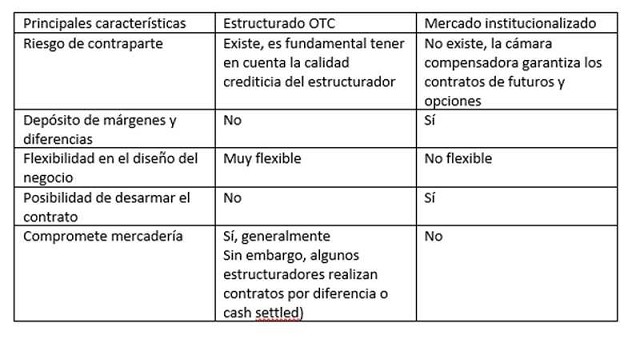 Este tipo de contratos suele ser ofrecido en su versión OTC por estructuradores. Las mismas ventajas y desventajas que tiene un forward con respecto a un futuro, se trasladan a la comparación entre las estrategias descriptas en su versión institucionalizada y OTC. Es decir que si en lugar de vender el call en el mercado de futuros, vamos por la versión OTC no tendremos que depositar márgenes ni diferencias (si el subyacente aumenta de precio) pero vamos a comprometer mercadería física (si el call resulta ejercible al vencimiento) y no vamos a poder desarmar la estrategia antes del vencimiento. Los aspectos favorables y desfavorables enumerados se resquemen en la Figura 1.