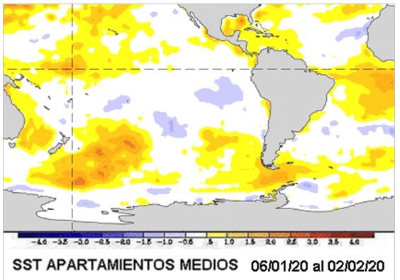 Tampoco se notan anomalías de consideración sobre el litoral Atlántico, no obstante la entrada de humedad desde el noreste ha sido eficiente. Los modelos experimentales que analizan el comportamiento de esta cuenca oceánica, no presentan desvíos significativos para el resto de la estación.