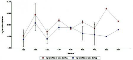 El contenido de antioxidantes se midió a través del contenido de fenoles totales, observándose diferencias significativas entre los tratamientos (Tabla 2). En la Figura 1 se observa que el contenido de fenoles totales fue mayor en las muestras de leche de las vacas que consumieron una ración suplementada con tegumento de maní durante la mayor parte del ensayo.