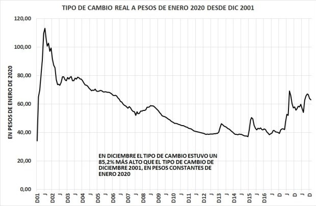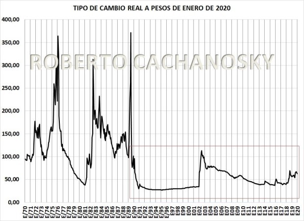 Entre noviembre de 2019 y enero de 2020 el tipo de cambio se mantuvo estable en torno a los $ 63, mientras que la tasa de inflación acumulada fue del 11% en el mismo período. Otra vez se está usando el tipo de cambio como ancla inflacionaria, con un BCRA que sigue expandiendo la base monetaria y pisando las tarifas de los servicios públicos y de ciertos precios cuidados para frenar transitoriamente el aumento del IPC pero no la inflación. En definitiva, para frenar la inflación, atrasan el tipo de cambio y apuntan a un modelo de sustitución de importaciones creyendo que con eso vamos a crecer.