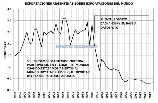 El gráfico 3 muestra nuestra participación en el comercio mundial. Cuando fuimos un país abierto al mundo, las exportaciones argentinas representaban entre el 2% y el 3% del total de las exportaciones mundiales. Actualmente representan el 0,3% del total mundial. Dicho de otras palabras, si hubiésemos mantenido nuestra participación en el comercio mundial, en vez de cerrarnos al mundo, hoy deberíamos estar exportando US$ 572.000 millones anuales en vez de los escasos US$ 70.000 millones que se exportaron el año pasado.