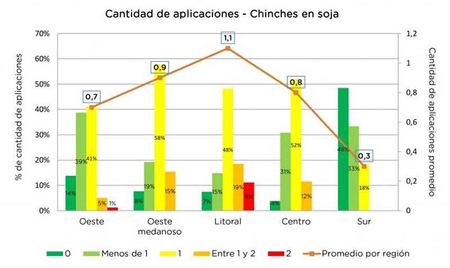 Según una encuesta a productores de Aapresid durante la campaña 2018-2019 se realizaron en promedio casi 0,8 aplicaciones para el control chinches en soja. Si diferenciamos según región, el Litoral (Entre Ríos y Santa Fe) fue la que presentó el mayor valor con 1,1 aplicaciones, habiendo aplicado 2 veces en el 11% de los lotes y la región Sur (sur de Buenos Aires) presentó el menor valor con 0,3 aplicaciones, donde casi el 50% de los lotes no recibió aplicación.