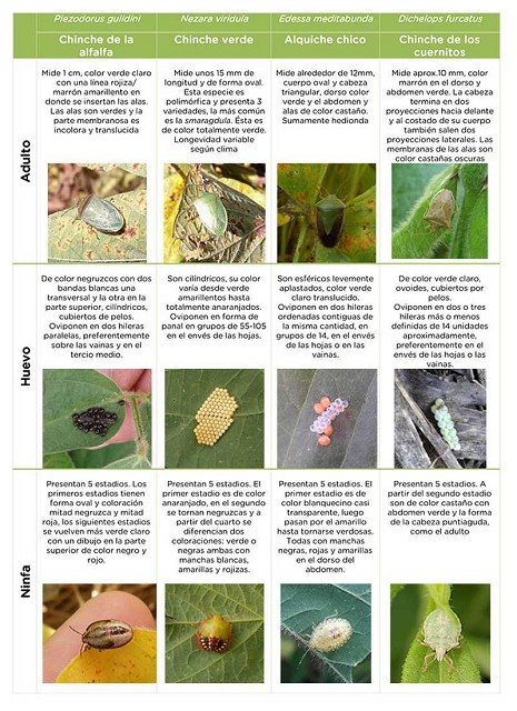 En nuestro país hay principalmente cuatro especies de chinches que ocasionan los mayores daños a este cultivo durante la parte final del ciclo: Nezara viridula (chinche verde), Piezodorus guildinii (chinche de la alfalfa), Dichelops furcatus (chinche de los cuernitos) y Edessa meditaunda (alquiche chico). Es común la utilización del término “complejo de chinches fitófagas” para agrupar a estas especies.