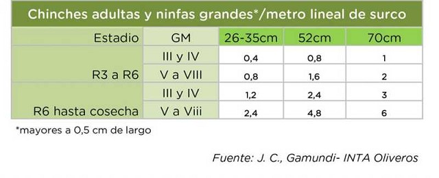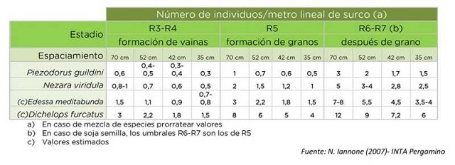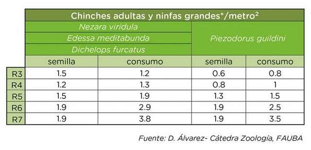 El conocimiento del estatus de la población plaga en el lote obviamente tiene como objetivo la toma de decisión correcta al momento del control. En consecuencia también es necesario contar con un valor umbral por encima del cual se deberían tomar esas medidas de control. En la bibliografía nacional hay diversas tablas que sirven de guía para determinar el Umbral de Daño Económico (UDE) de cada sistema, teniendo en cuenta la especie de chinche, el estadio del cultivo y la distancia entre surcos, ya que hay diferencia en el impacto de la chinche según estas particularidades. Cabe aclarar que los autores coinciden con que este valor lejos de ser estático es variable en el tiempo, ya que debe considerar factores de importancia en la ecuación como el precio de la soja, activo a usar y costo del mismo, entre otros.