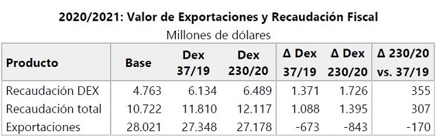 Para la campaña 2020/21 la recaudación total aumentaría en USD 307 millones respecto de lo estimado con las alícuotas del Decreto 37/2019, con un costo adicional en términos de exportaciones de USD 170 millones. En comparación al escenario Base, la recaudación aumentaría en USD 1.395 millones, mientras el valor exportado se reduciría en USD 843 millones.