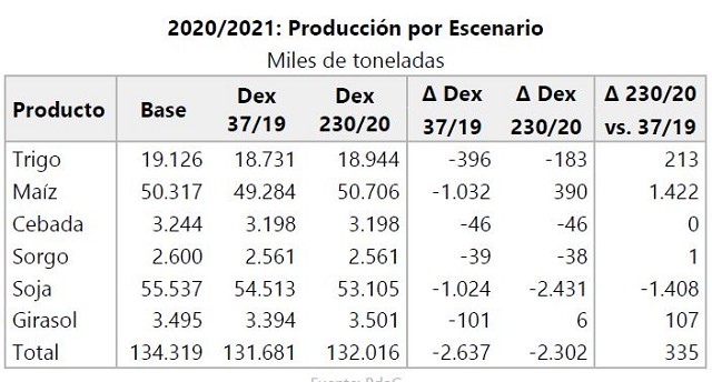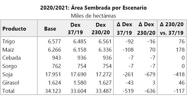 De ese modo, se estima una caída significativa en el área sembrada, como resultado de los menores ingresos de los productores. La tabla que sigue muestra cómo la intención de siembra total, que disminuiría 519 mil has. como consecuencia de los cambios aprobados en diciembre con el Decreto 37/2019, se vería aún más afectada con los cambios recientes (Decreto 230/20), con 636 mil has. menos que en el escenario Base.