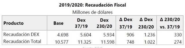 Considerando la producción que ya se encontraba comercializada al momento de adoptarse el Decreto, para la campaña 2019/20 el nuevo esquema implicaría una recaudación adicional de USD 330 millones respecto de la situación prevista bajo el anterior Decreto 37/2019, totalizando un aporte al fisco por derechos de exportación de las 6 cadenas de cultivos extensivos de USD 5.936 millones. La recaudación total aumentaría en menor cuantía (USD 274 millones), dada una disminución en lo recaudado por otros impuestos, llevando la recaudación total a USD 11.598 millones.