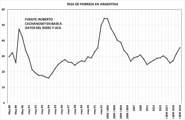 Si bien es complicado armar una serie histórica de la pobreza en Argentina dado que en una época no se publicaba en forma sistemática el índice de pobreza, luego el kirchnerismo dejó de publicarla y, finalmente, también fue cambiando la metodología de medición, lo cierto es que, juntando los datos disponibles con son más consistentes, la tendencia es al alza, más allá de los picos inflacionarios de 1989 y del salto inflacionario de principios de 2002, cuando la pobreza alcanzó niveles del 54%.