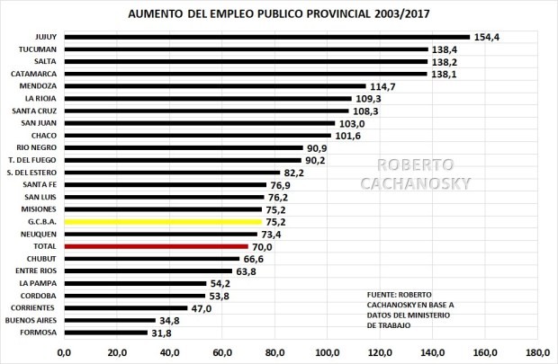 Si al crecimiento de los planes sociales que mostraba en los gráficos anteriores les sumamos el aumento del empleo público en las provincias, que entre 2003 y 2017 creció, en promedio, el 70%. Este incremento significa 955.603 nuevos “empleos” estatales en las provincias, por lo tanto si a los 21 millones de personas que reciben planes sociales le sumamos otro millón de empleados públicos que hay que mantener del bolsillo de contribuyente, tenemos que el 46% de la población recibe plata de los 7 millones de personas que trabajan en blanco. Esto y pavimentar el camino a la pobreza es exactamente lo mismo.