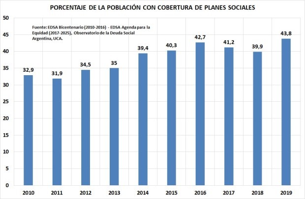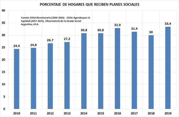 De acuerdo a los datos del Observatorio de la Deuda Social de la UCA, en 2019 el 33,4% de los hogares recibía algún plan social. Puede observarse que entre 2010 y 2015 el gobierno kirchnerista pasó de darle planes sociales del 24,4% de los hogares al 30,8%, es decir, 6,4 puntos porcentuales más. Cambiemos aumento ese porcentaje 2,6 puntos porcentuales. En total, se pasó de entregarle planes sociales al 24,4% de los hogares en 2010 al 33,4%. 9 puntos porcentuales más y a pesar de ello más pobreza.