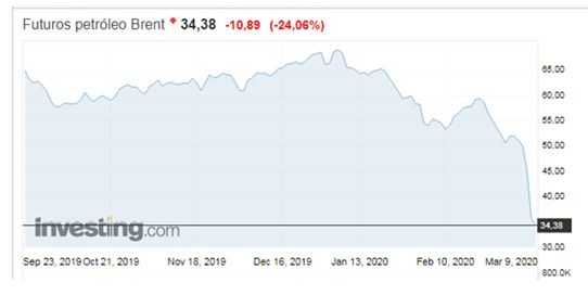 El precio del barril del crudo Brent, este lunes bajó un 26,31 %, hasta cotizar a 33,36 dólares en el comienzo del día. Se trata de la mayor caída en una jornada desde 1991, cuando la primera Guerra del Golfo.