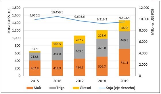 La participación de las exportaciones del complejo sojero (sumado biodiesel) disminuyó del 93,8%, en 2015, al 86,6%, en 2019. Esto fue en contraposición de un aumento en el resto de los complejos agrícolas: el complejo triguero pasó del 2,0% al 4,3%; el complejo del maíz pasó del 3,9 al 6,5% y el girasol multiplicó su proporción casi por 9, pasando del 0,3% al 2,6% (gráfico 2).