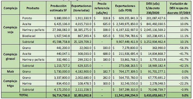 Cuadro 2. Estimación para 2020 de exportaciones y aporte por derechos de exportación (DEX) de los principales complejos agrícolas de la provincia de Santa Fe.