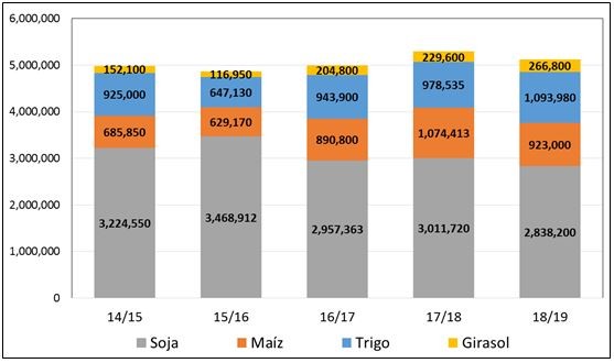 En las proyecciones de producción de granos para la campaña 2019/2020 se tomó de referencia, para los casos de soja y maíz, las estimaciones realizadas por la Bolsa de Comercio de Rosario al 11 de marzo de 2020. La entidad proyecta una producción de soja en la provincia de 9,88 millones de toneladas y de maíz de 7,64 Mtn. Por otro lado, dado que las campañas de los cultivos de trigo y girasol ya finalizaron, se puede tomar de referencia las estimaciones elaboradas por el Ministerio de Ganadería, Agricultura y Pesca de la nación (MAGyP). Así, se toma de referencia una producción de girasol de 441.200 toneladas en el territorio provincial y de trigo de 3.337.800 toneladas.