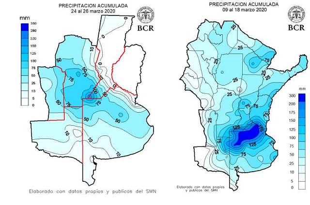 La recuperación de humedad que se viene dando desde el 9 de marzo sumó un nuevo episodio de lluvias. La tormenta que se desarrolló desde el martes 24 de marzo sorprendió con registros mayores de lo que se esperaba y se desplegó sobre un área muy importante del centro y el oeste de la región pampeana. El epicentro de estas lluvias fue en suroeste de Santa Fe. En Rufino, en solo 48 horas se acumularon 172 mm. Córdoba fue la más privilegiada, recibió lluvias en todo su territorio. En más de la mitad del territorio cordobés, la parte sur, los registros estuvieron entre 50 y 100 mm. Los máximos valores de lluvia se midieron en Hernando y Guatimozín, ambas con 110 mm. También las lluvias alcanzaron con más de 50 mm a buena parte del norte Bonaerense. Sin embargo el máximo acumulado se registró en el centro norte, en Saladillo, con 84 mm.