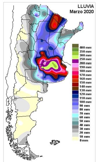 Es muy extendida la zona donde los acumulados pluviales han estado por encima de los 250 milímetros y en localidades emblemáticas de la zona, como Junín, Bragado, 25 de Mayo o Saladillo, los registros superaron los 300 milímetros. En gran parte de la zona, los acumulados al menos duplicaron los valores normales del mes de marzo.