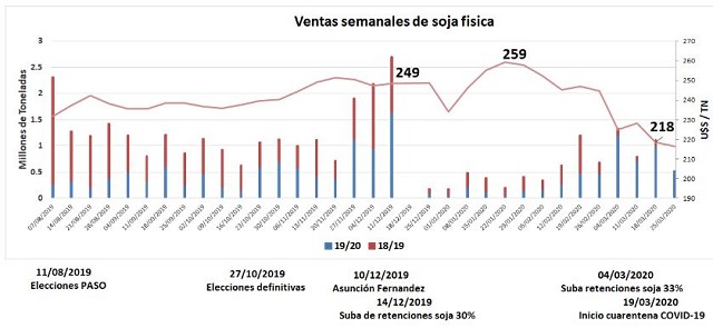 Veamos las decisiones de venta de soja tomadas desde agosto del año pasado hasta fin de marzo para la soja física 18/19 y 19/20, y la evolución del precio disponible en Dólares por tonelada, según la pizarra de Rosario, todo hilvanado a una serie de sucesos bajistas.